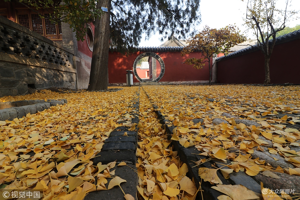 2018年11月13日,山東泰安,冬風(fēng)吹拂,泰山普照寺千年銀杏樹下,古磚上鋪了一層層、一疊疊黃金的銀杏葉子,像鋪成了黃金地毯,場面十分壯觀。