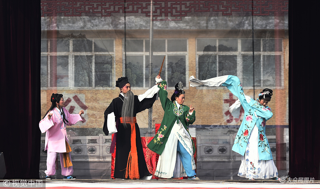 2018年11月14日,山東省鄒平市呂劇團(tuán)在臨池鎮(zhèn)小臨池村為百姓演出傳統(tǒng)呂劇《龍鳳面》。