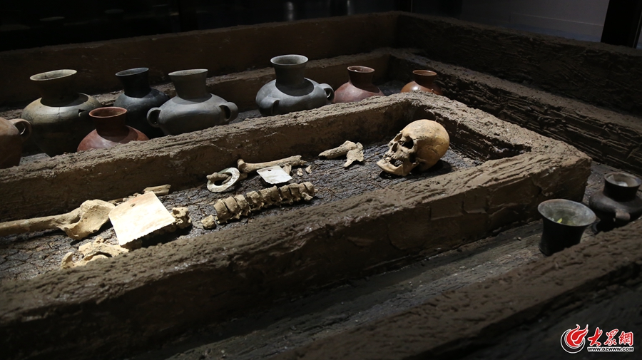 此前引起媒體和社會廣泛關注的1.9米身高“山東大漢”,此次也單獨開辟展示展出,觀眾可與5000年前先祖進行一番“心靈交流”。據(jù)了解,出土“山東大漢”的土坑豎穴墓,墓口長3.8米,寬2.1米。面積約為7.98平方米。葬具為一棺一槨。共隨葬18件隨葬品,陶器壺、背壺和陶罐等。