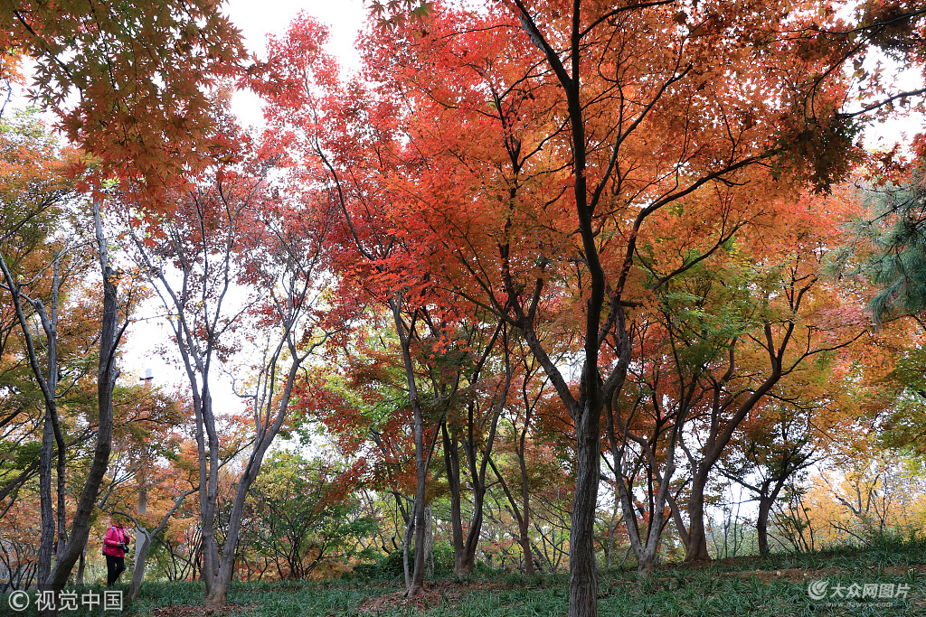 2018年11月15日,濟(jì)南,色彩艷麗的樹(shù)木將泉城公園裝點(diǎn)得分外美麗,市民漫步其中,宛如在畫中游。