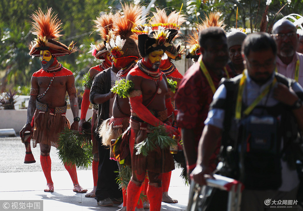 當(dāng)?shù)貢r(shí)間2018年11月16日,巴布亞新幾內(nèi)亞莫爾茲比港,國家主席習(xí)近平到訪將出席APEC峰會(huì),當(dāng)?shù)貙⑴e行歡迎儀式,圖為表演者穿傳統(tǒng)服飾等待過安檢。