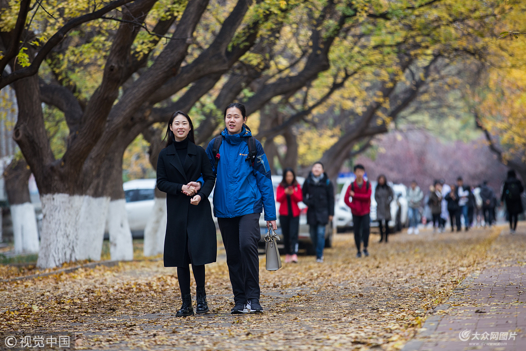 2018年11月17日,濟(jì)南秋意濃濃,山東師范大學(xué)校園內(nèi)落葉飛舞,在校園內(nèi)的一條主干道上,金黃的樹葉鋪滿一地,美麗無比,學(xué)生上課仿佛穿越畫中,可以盡情欣賞這唯美的秋色。