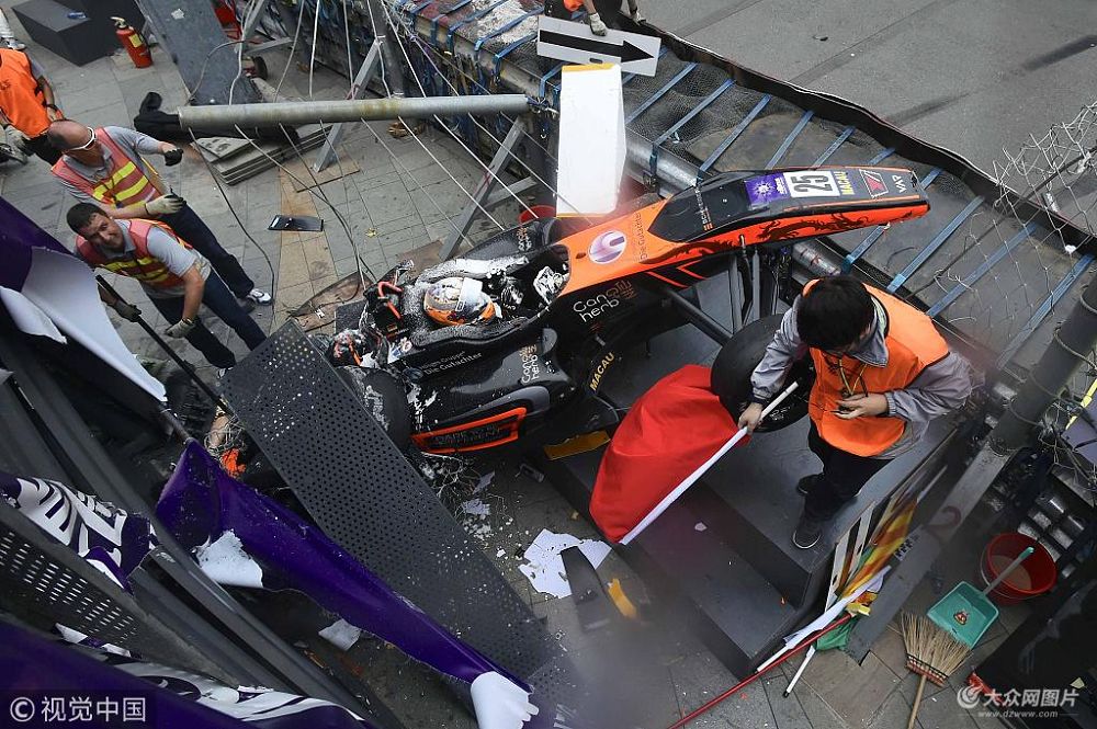 2018年11月18日,中國澳門,2018澳門格蘭披治大賽車第4日三級(jí)方程式,一架賽車失控撞上記者臺(tái)。車手在被救出時(shí)仍然有反應(yīng),另外兩名工作人員及一名在臺(tái)上的記者受傷送院救治。 麥尚旻(香港分社)/中新社/視覺中國