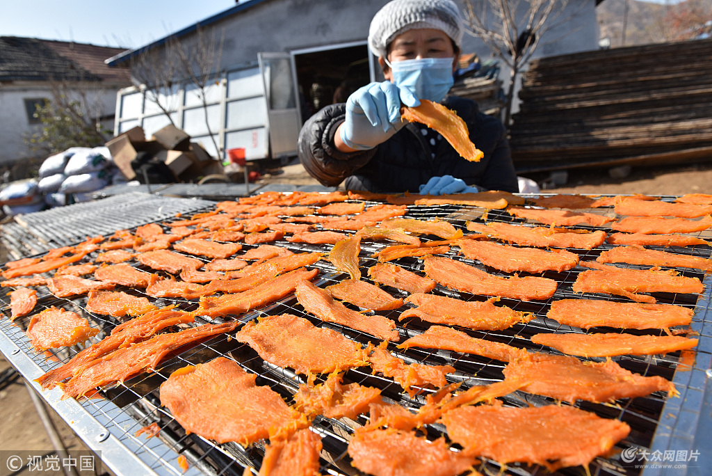 2018年11月19日,在山東省日照市五蓮縣潮河鎮(zhèn)下石河村子新農(nóng)產(chǎn)品專業(yè)合作社,一名農(nóng)村婦女正在收集烘烤完成的地瓜干。在農(nóng)閑時節(jié),該合作社組織十幾名農(nóng)婦加工制作地瓜干,每斤12元錢,非常暢銷,價格比豬肉還貴,成為農(nóng)民致富增收的新途徑。