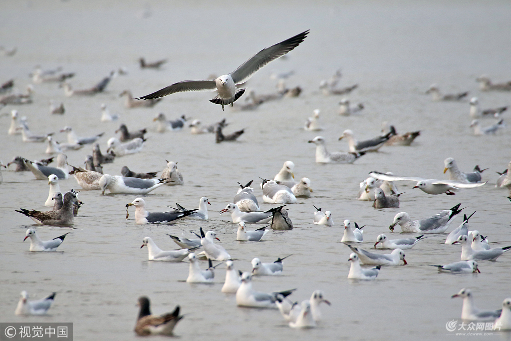 2018年11月23日,山東煙臺高新區(qū),大批越冬海鷗聚集在海邊。