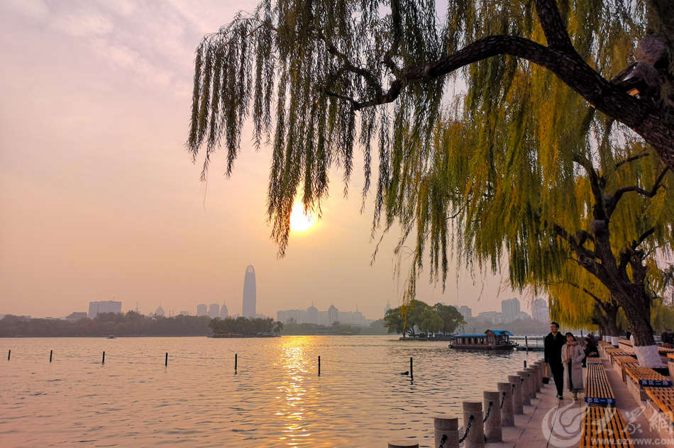 湖岸邊,泛黃的垂柳隨風(fēng)舞動(dòng),夕陽灑在湖面留下一片金黃。不少游人不顧寒風(fēng)漫步在湖畔,欣賞冬日下的明湖美景。(大眾網(wǎng)-山東24小時(shí)客戶端記者 畢勝)
