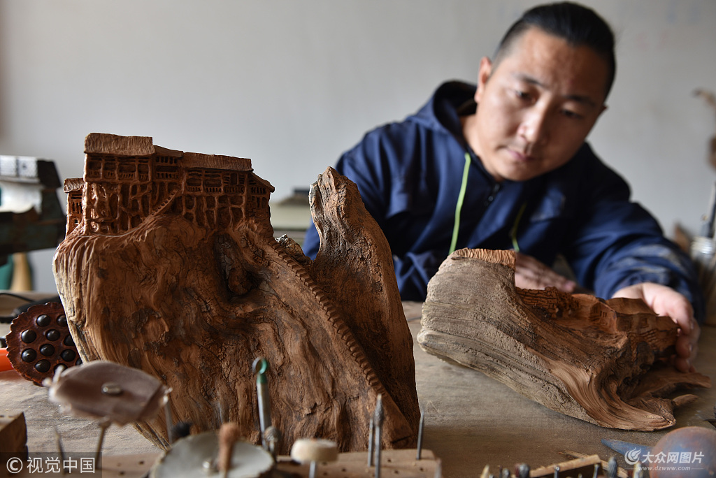 2018年11月24日,山東日照,在莒縣碁山鎮(zhèn)俊杰創(chuàng)業(yè)孵化中心一處崖柏展廳,今年36歲的青年陳志強正在打磨崖柏雕刻作品。