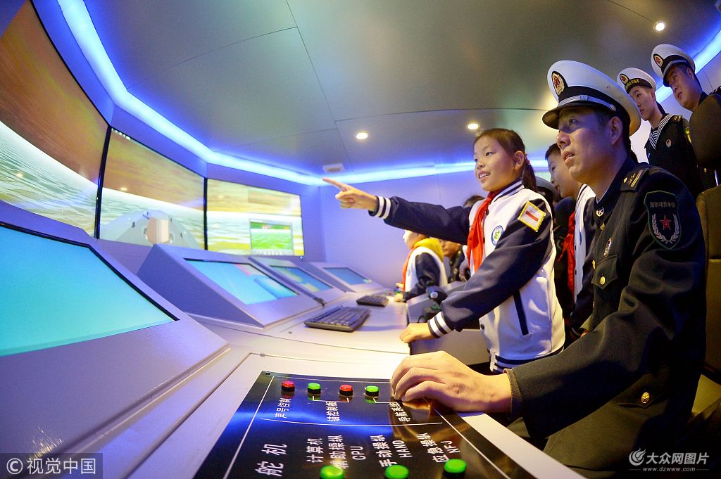 2018年11月26日,青島,臺(tái)湛路小學(xué)的學(xué)生們與駐地海軍官兵一起通過(guò)大型驅(qū)逐艦?zāi)M器模擬海戰(zhàn),增強(qiáng)國(guó)防意識(shí)。