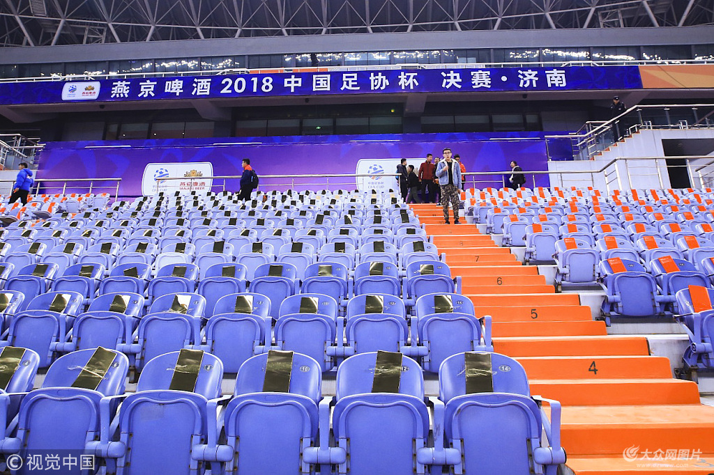 2018年11月29日,山東濟南,2018足協(xié)杯決賽次回合前瞻,場內布置一覽,決賽元素氣氛已具。
