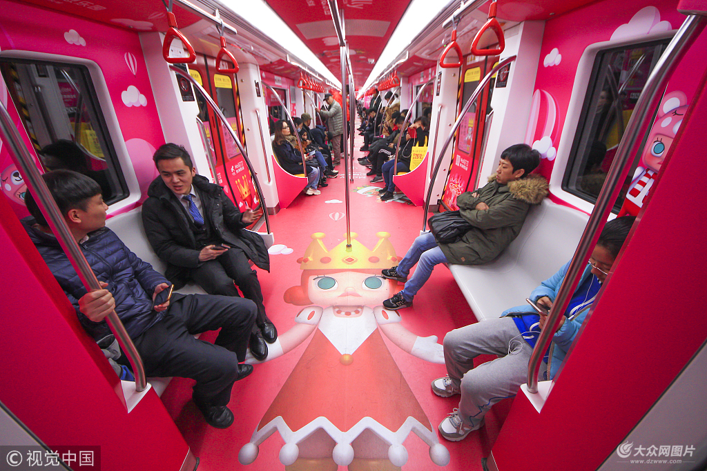 2018年12月3日,天津,一組名為“夢幻暢想樂園”的粉紅色系主題地鐵車廂亮相。