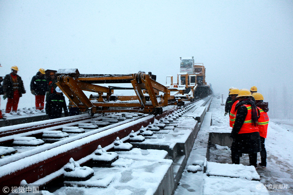 2018年12月5日,山東臨沂,在魯南高鐵臨沂市平邑段,中鐵十四局員工在風(fēng)雪中作業(yè)。當(dāng)日臨沂迎來降雪,承擔(dān)魯南高鐵臨曲段鋪軌任務(wù)的中鐵十四局員工們堅(jiān)守在崗位作業(yè)。魯南高鐵是國(guó)家“八縱八橫”快速鐵路網(wǎng)的重要聯(lián)接通道,在山東高速鐵路建設(shè)史上為建設(shè)里程最長(zhǎng)、投資規(guī)模最大、建設(shè)條件最復(fù)雜、沿線人口最多的鐵路項(xiàng)目。項(xiàng)目東起日照市,西至鄭徐客專蘭考南站接軌,全長(zhǎng)約494公里,設(shè)計(jì)時(shí)速350公里。目前進(jìn)入鋪軌階段的魯南高鐵臨沂至曲阜段有望比預(yù)期時(shí)間提前一年,在2019年底建成通車。