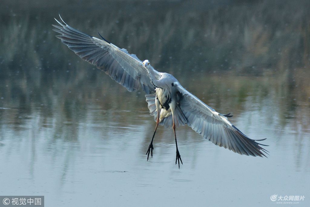 2018年12月10日,翩躚起舞的蒼鷺在青島城陽區(qū)墨水河上覓食。