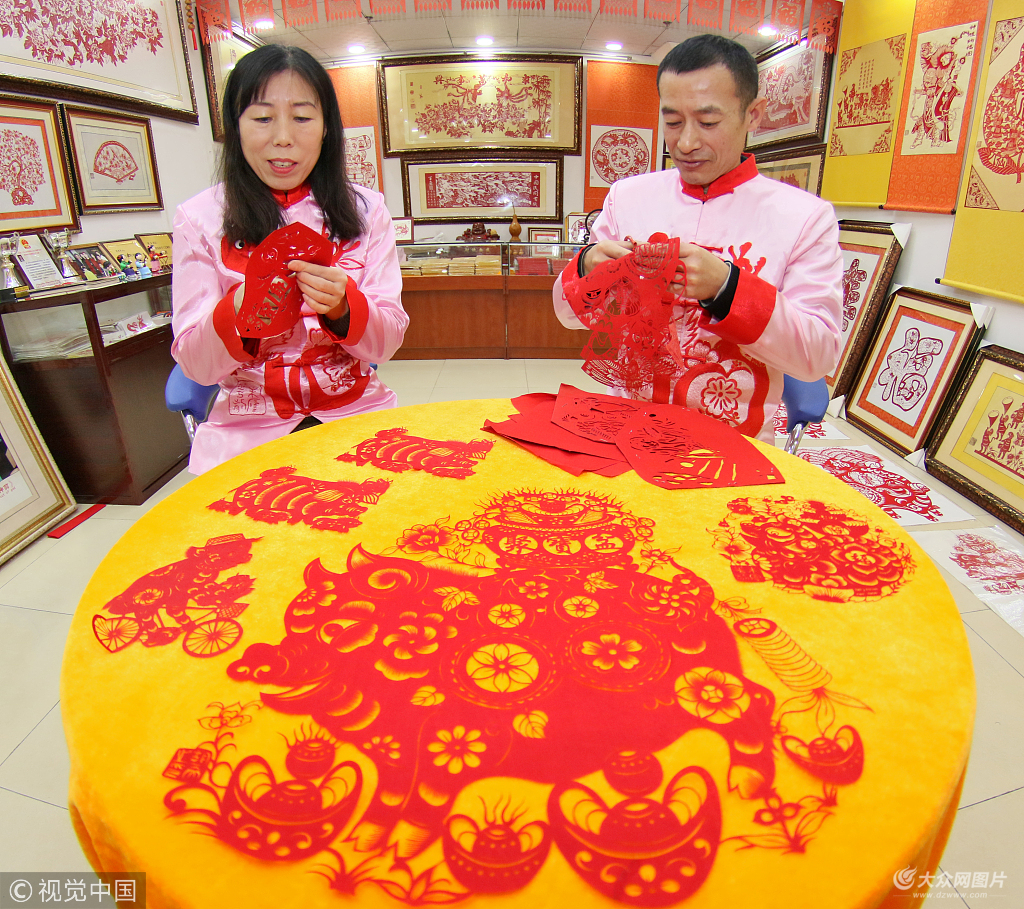 2018年12月9日,山東煙臺(tái),煙臺(tái)剪紙非遺傳承人胡文、孫潔夫婦正在創(chuàng)作豬年主題系列剪紙作品。