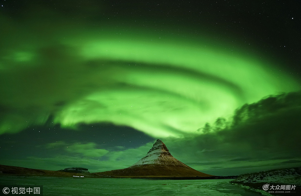 冰島西海岸高463米的Kirkjufell山上空出現(xiàn)極光,湖泊山峰極光交相輝映宛如夢(mèng)境。