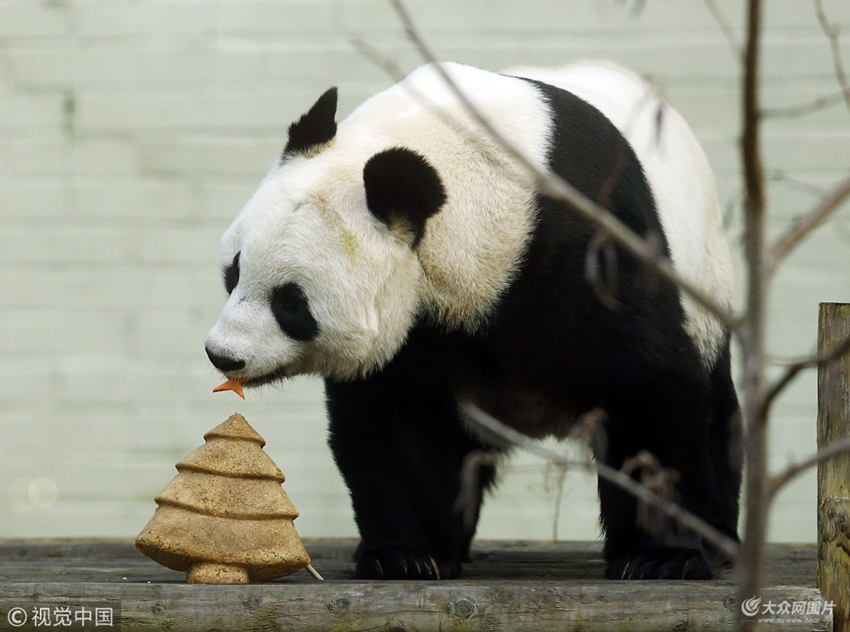 英國蘇格蘭愛丁堡,愛丁堡動物園中的大熊貓?zhí)鹛鹣碛锰刂频氖フQ樹形狀的蛋糕,迎接圣誕節(jié)到來。