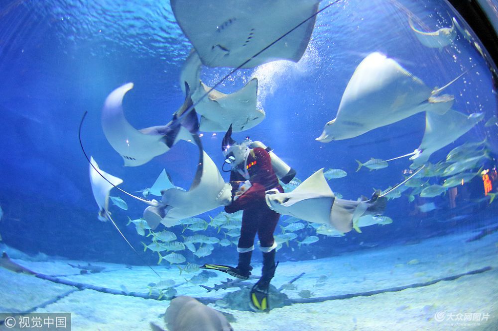 2018年12月24日,山東煙臺海昌鯨鯊海洋公園的潛水員們穿上特制的圣誕老人服裝,在海底與鯨鯊、鰩魚等海洋動(dòng)物親密互動(dòng),迎接圣誕節(jié)的到來。