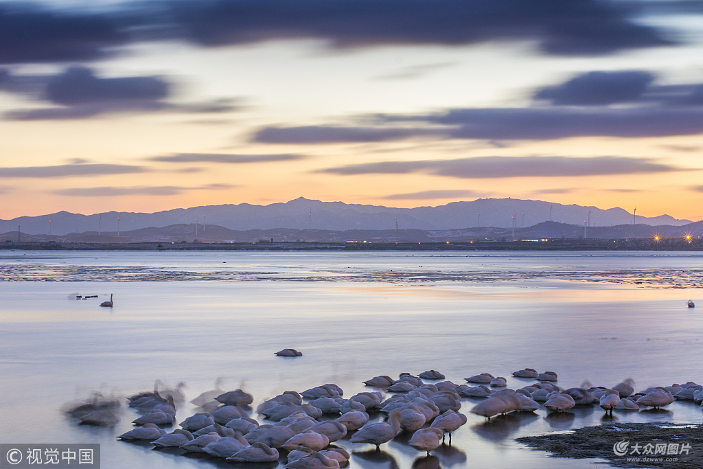 2018年12月28日,山東威海榮成雪后晴天,暮色時分美景如畫。不少天鵝在此越冬,吸引不少攝影愛好者采風(fēng)。