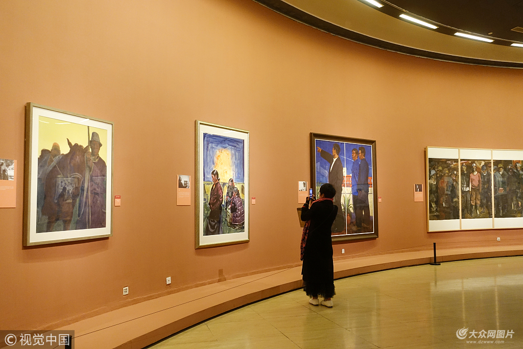 2019年1月6日,北京,參觀者在中國美術館觀賞“風生水起——當代中國水彩畫作品展”。