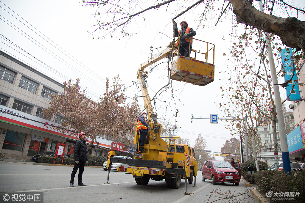 2019年1月7日,山東棗莊,針對(duì)道路兩邊部分樹枝嚴(yán)重遮擋路燈、對(duì)過往行人車輛造成安全隱患的情況。園林管理處組織專業(yè)技術(shù)人員開始對(duì)城區(qū)行道樹進(jìn)行全面修剪。