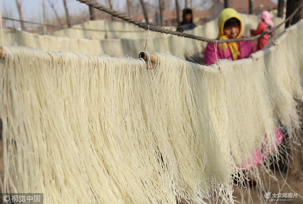 2019年1月8日,山東濱州,在博興縣店子鎮(zhèn)張侯村,幾名農(nóng)民正在晾曬手工紅薯粉條。