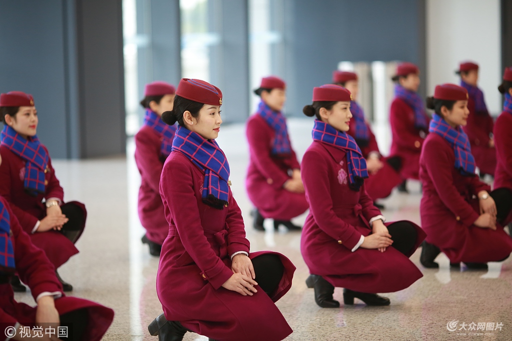 2018年1月8日,重慶,中國鐵路成都局集團(tuán)有限公司重慶客運(yùn)段動車四隊(duì)開展動車組乘務(wù)員集中培訓(xùn),強(qiáng)化練習(xí)動車組服務(wù)禮儀和標(biāo)準(zhǔn)動作,為即將到來的春運(yùn)做好準(zhǔn)備。