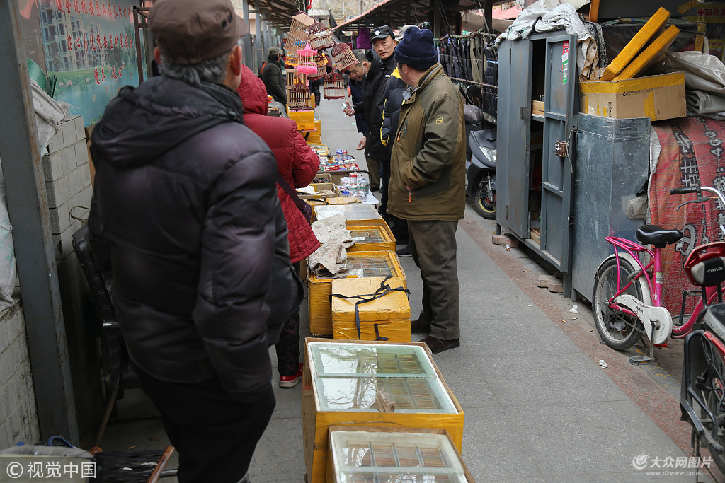 2019年1月9日,山東濟南英雄山北側(cè)市場內(nèi)聚集很多人,白色泡沫箱子上面蓋著透明的玻璃,箱子內(nèi)整齊擺放著形狀各異的瓶瓶罐罐,里面裝著蟈蟈。