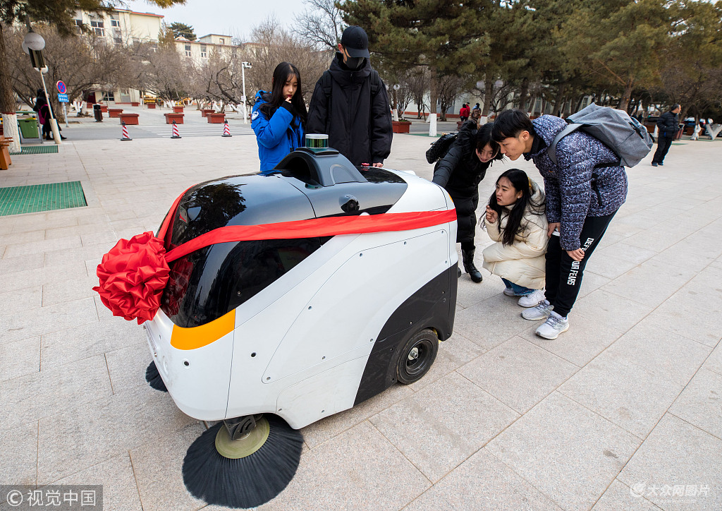2019年1月9日,呼和浩特,無人駕駛清掃車“蝸小白”在內(nèi)蒙古師范大學校園內(nèi)進行清掃作業(yè)。