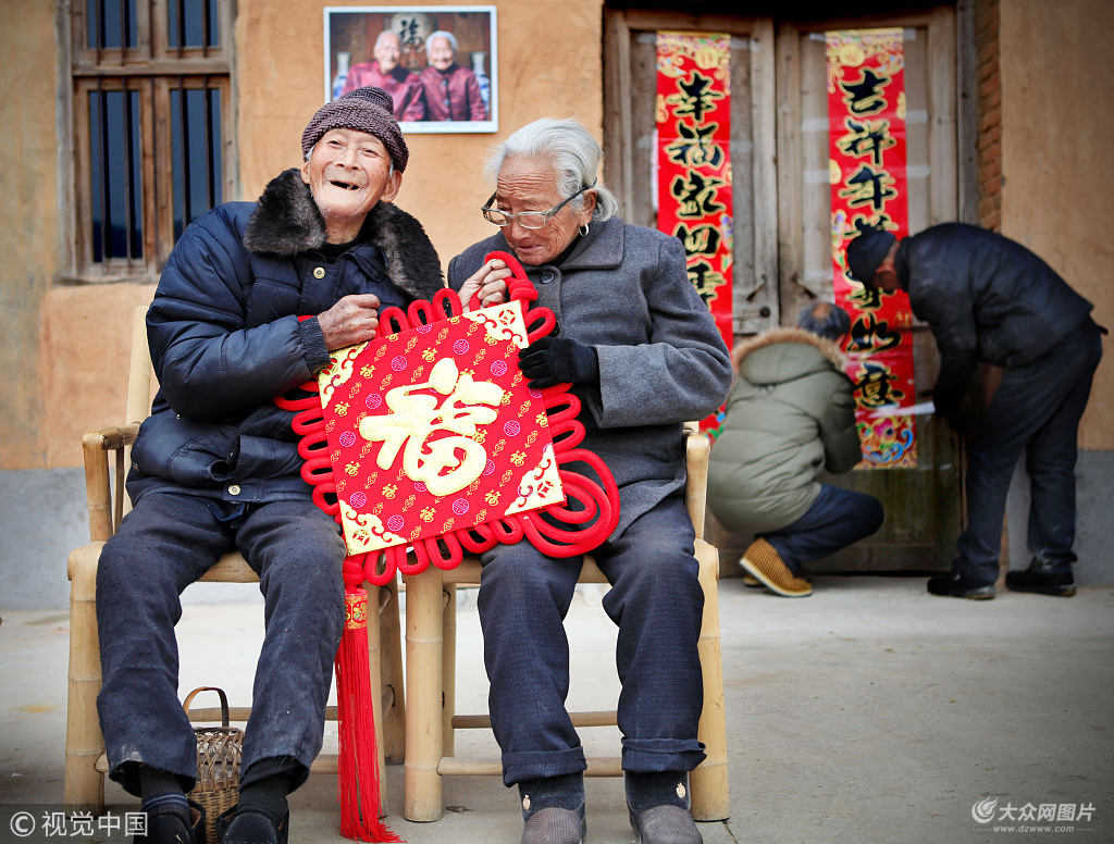 2015年2月1日,浙江麗水,龍泉市蘭巨鄉(xiāng)仙仁村,養(yǎng)老服務(wù)中心的管理員和一些村民為村里的這對浙江省唯一一對百歲夫妻季盛康、柳先秀帶去新春祝福與慰問,并幫他們貼上新春對聯(lián)。