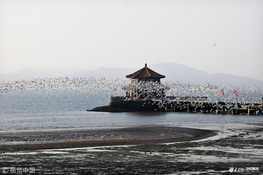 2019年2月1日,青島前海棧橋海域出現(xiàn)大批海鷗集群飛行盤旋,在青島標(biāo)志性歷史建筑回瀾閣周圍,形成宏大的鳥浪景觀。