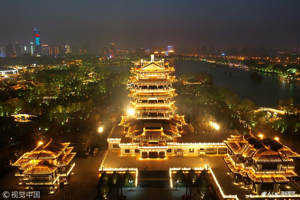 2019年2月4日,除夕夜,航拍濟(jì)南市大明湖風(fēng)景區(qū)湖面、亭臺樓閣、小橋流水燈光璀璨、美不勝收。
