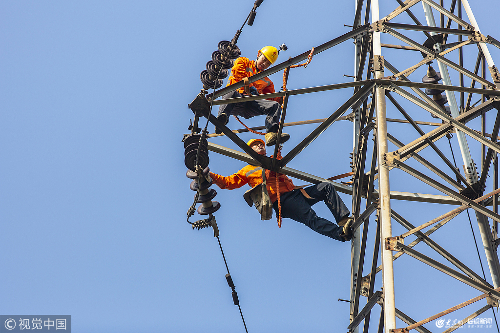江西鷹潭,凌空馬步,空中探步,像不像高空雜技人?高二好和師弟劉傳棟在30米高塔上擦拭懸式瓷瓶。