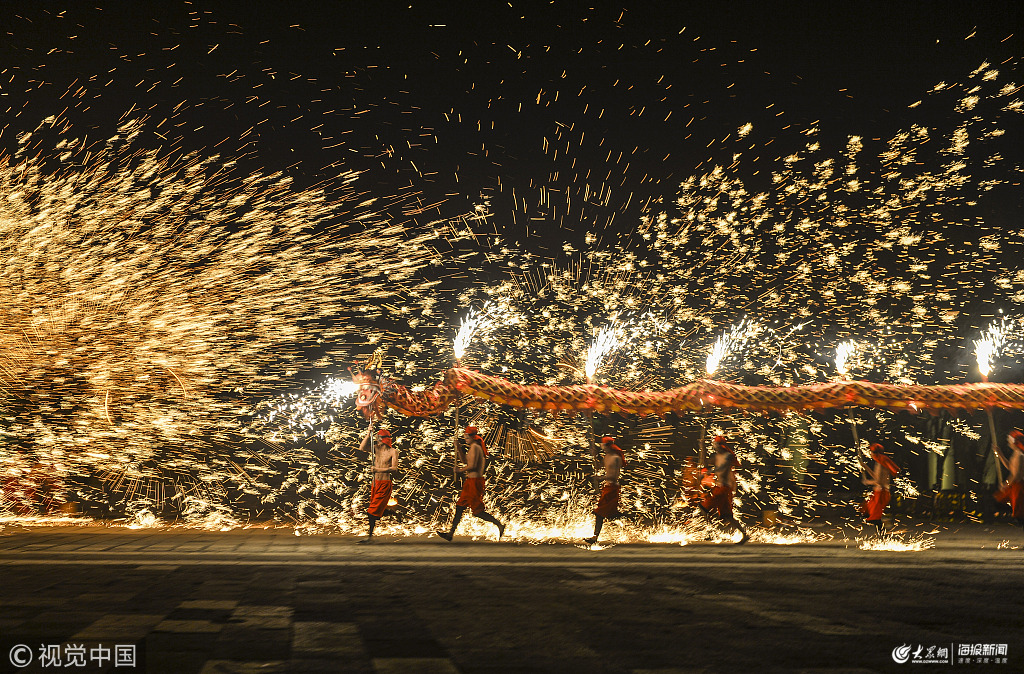 2019年2月5日,山東棗莊,民間藝人在山東臺兒莊古城景區(qū)表演非遺節(jié)目“火龍鋼花”。
