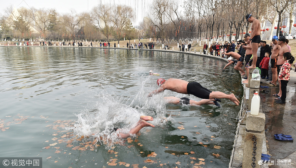 2019年2月5日,山東省濱州市鄒平市,冬泳愛好者們在游泳。