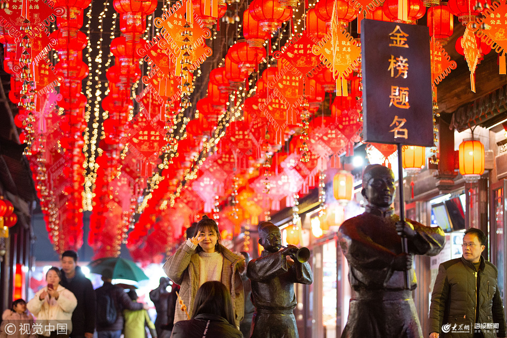 2019年1月28日,游人在南京夫子廟景區(qū)觀燈游覽。