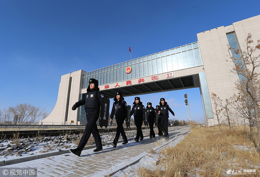 2019年2月3日,內蒙古錫林郭勒,二連出入境邊防檢查站民警頂著零下20度的惡劣天氣,在國門一線執(zhí)勤巡邏。