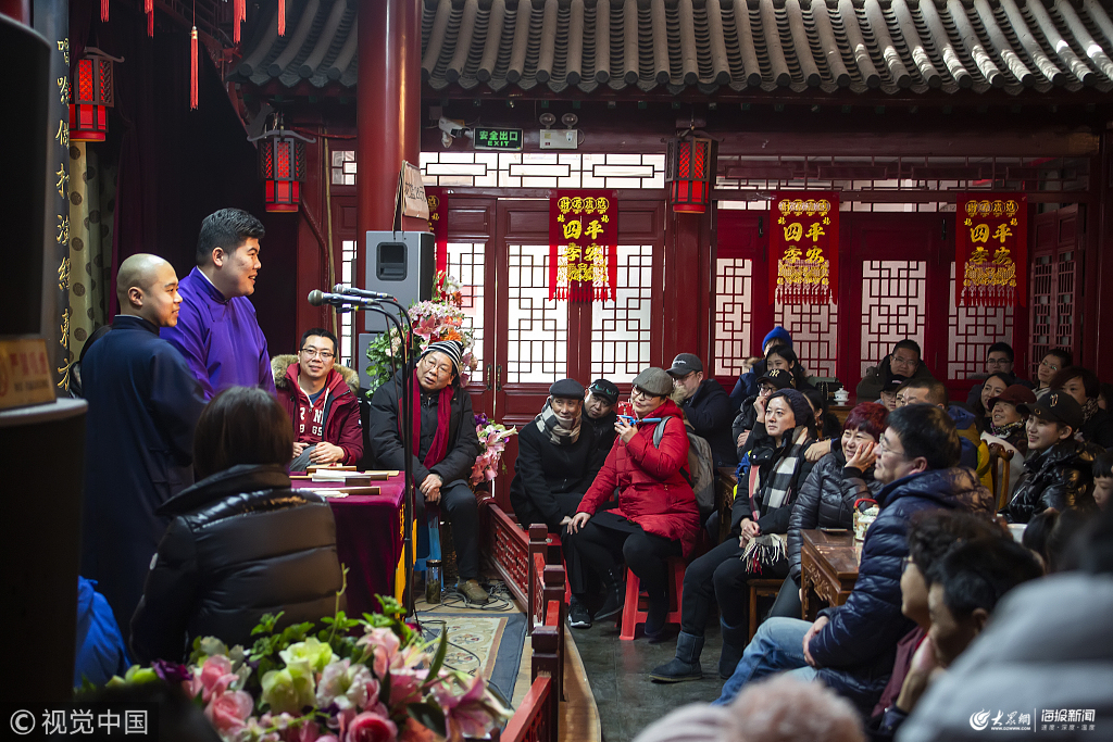 2019年2月7日,天津鼓樓。天津傳統(tǒng)相聲作為天津打造特色旅游的主打產(chǎn)品,在春節(jié)期間吸引了眾多游客,春節(jié)演出場場爆滿,座無虛席,加座游客甚至坐到了演出臺(tái)上,與演員同臺(tái),精彩的演出得到全國各地游客的熱烈喜愛和強(qiáng)烈推薦。