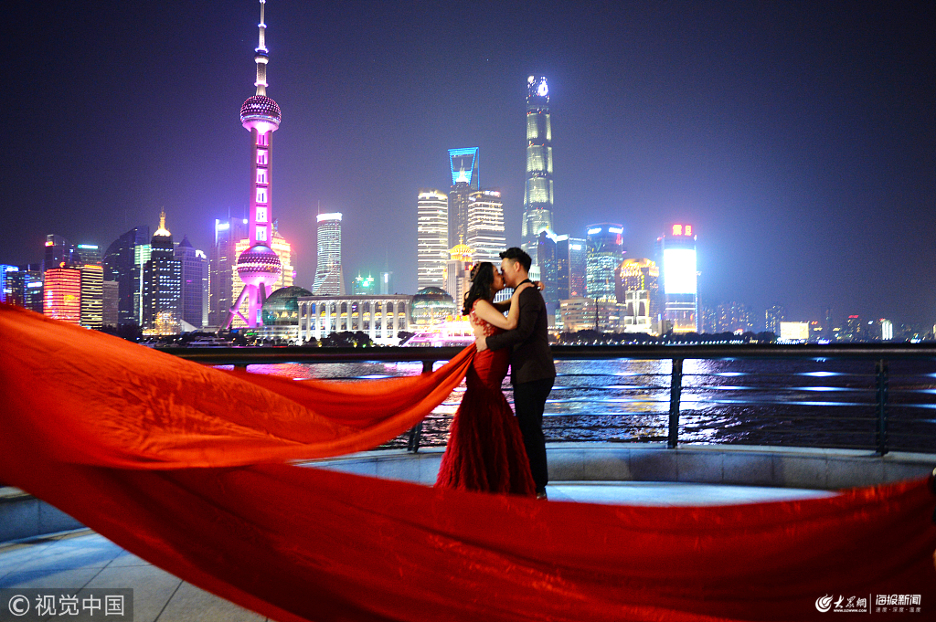 2017年12月17日,上海,夜幕下,一對熱戀青年在寒風中拍攝婚紗照。