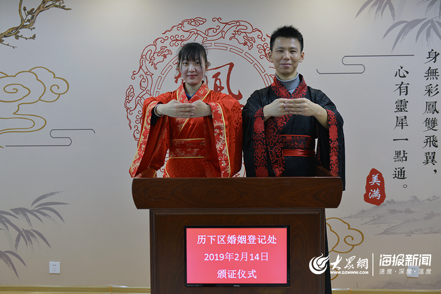 大眾網(wǎng)·海報(bào)新聞濟(jì)南2月14日(記者 李金珊 孫博洋)2月14日情人節(jié)這天,濟(jì)南迎來了今年的首場(chǎng)大雪,雪天絲毫沒有影響到新人情人節(jié)扎堆領(lǐng)證的熱情;14上午,濟(jì)南市歷下區(qū)民政婚姻登記處擠滿了前來登記結(jié)婚的新人。截止到下午5:00,在雪花紛飛的時(shí)間定格與見證中,歷下區(qū)民政局共接待辦理了143對(duì)新人登記。與以往不同,今天民政局還首次舉辦了具有民族傳統(tǒng)特色的“漢式婚禮式頒證”活動(dòng)。