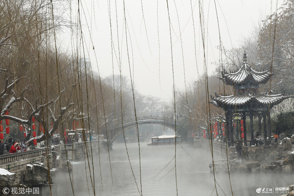 2019年2月14日,山東濟南,一場降雪過后,解放閣周邊護城河周邊霧氣繚繞。