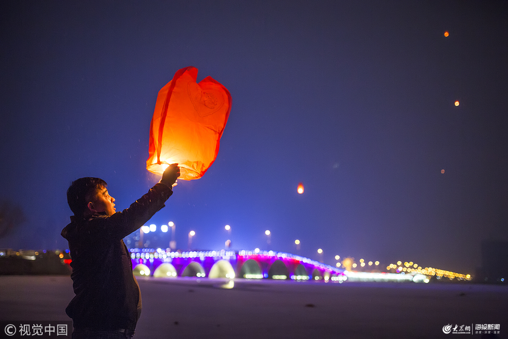2019年2月18日,山東濱州,元宵節(jié)來臨之際,眾多市民趕往中海景區(qū),在小雪中點亮孔明燈,為新年祈福,放飛心愿。