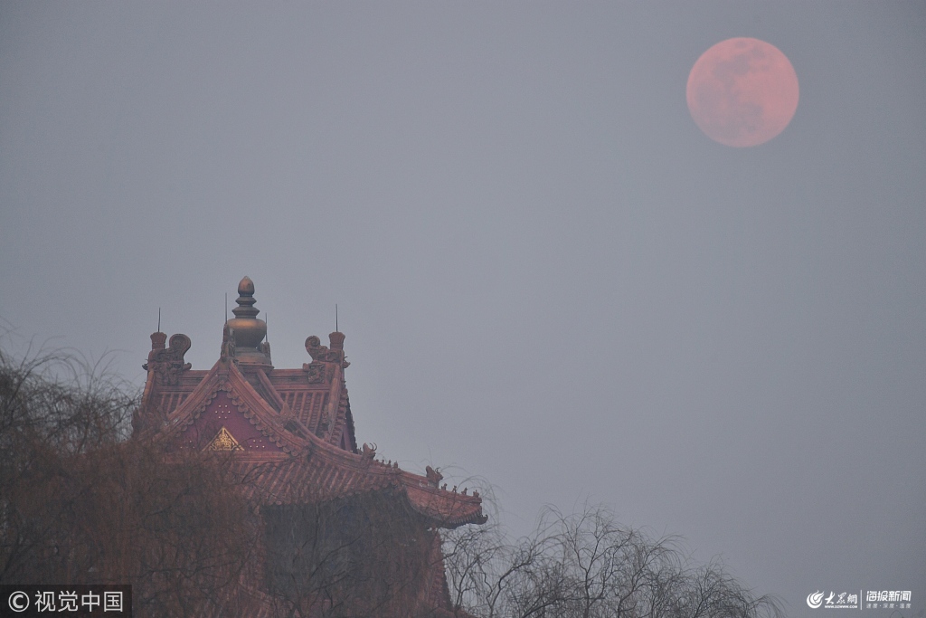 2019年2月19日,北京,元宵節(jié)恰逢超級(jí)月亮,傍晚六點(diǎn)月亮從角樓上方升起。