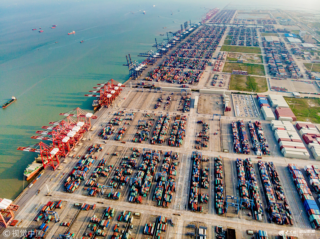 2018年12月14日,航拍廣州南沙自貿(mào)區(qū),南沙區(qū)海港大道,南沙新港集裝箱貨柜碼頭。