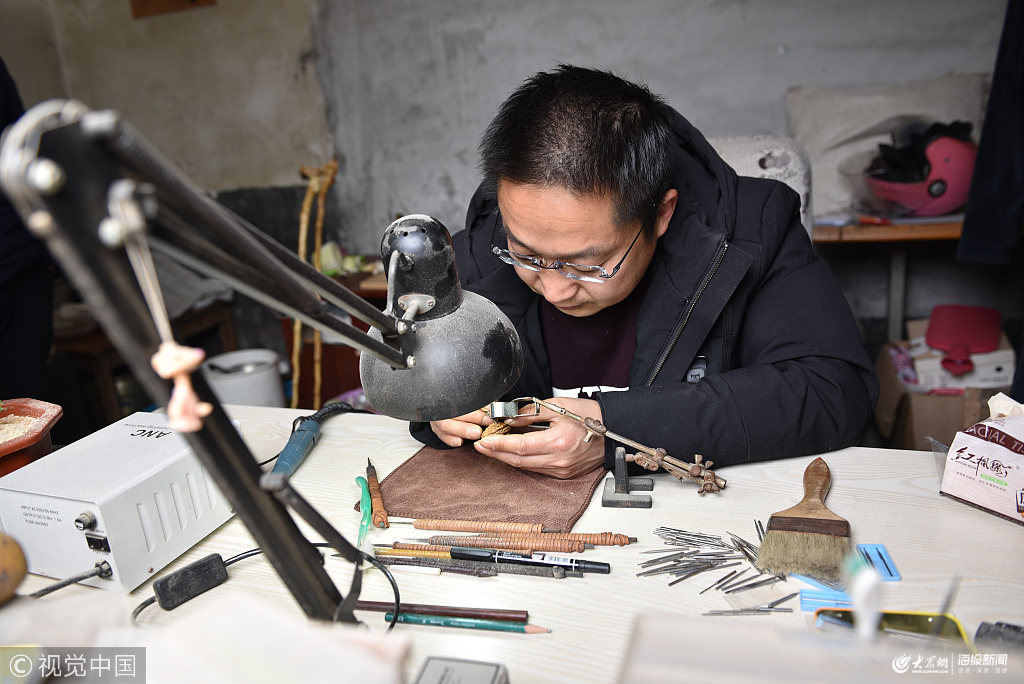 2019年2月22日,山東日照,在莒縣寨里河鎮(zhèn)下麻峪子村,今年41歲的李彥軍正在工作臺上雕刻作品。