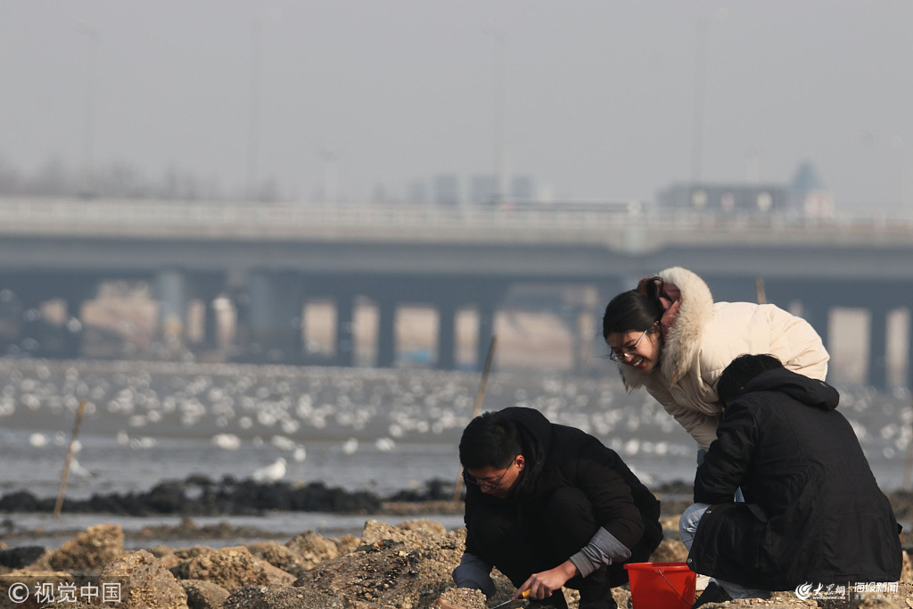 2019年2月23日,市民在青島膠州灣趕海。
