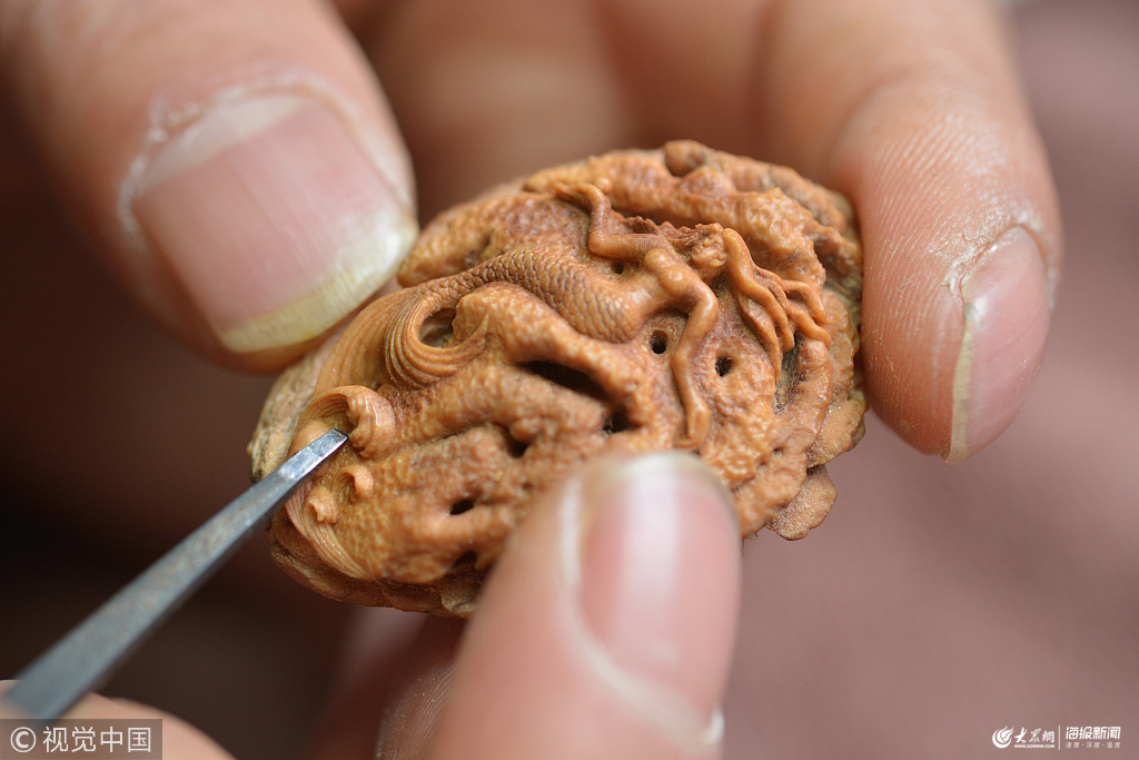 山東日照:男子辭職專(zhuān)做桃核微雕 一件作品賣(mài)上萬(wàn)元