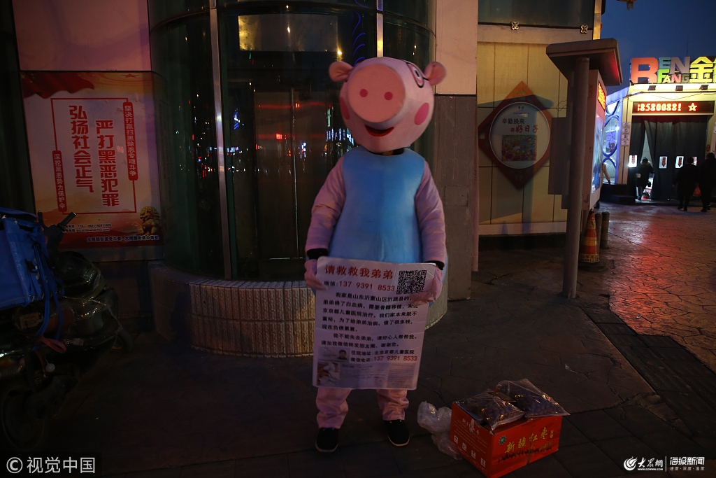 2019年2月25日,在山東濟(jì)南大觀園東邊,一位哥哥扮演小豬佩奇賣大棗籌錢為11歲的弟弟籌錢治白血病。稱不想失去弟弟,希望他重返校園。