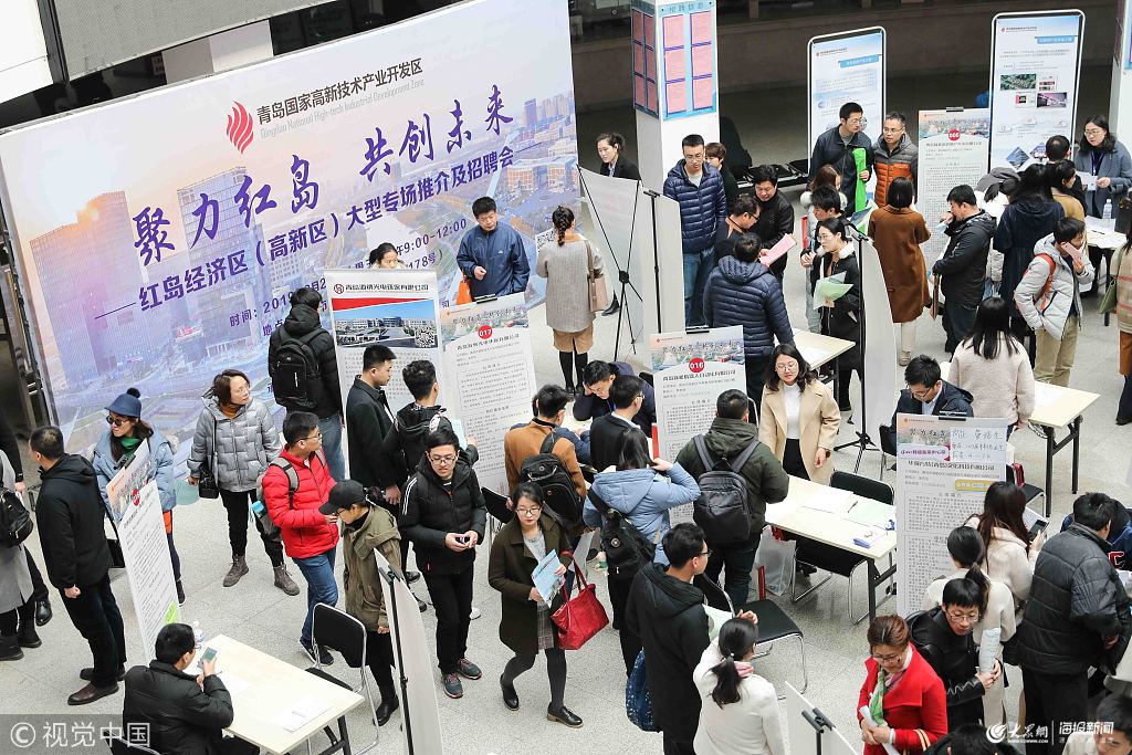 2019年2月27日,求職者在2019青島市紅島經(jīng)濟(jì)區(qū)(高新區(qū))大型專場(chǎng)推介及招聘會(huì)上查看招聘信息。