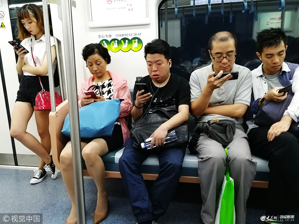2018年9月15日,上海地鐵上的乘客在用手機(jī)上網(wǎng)。