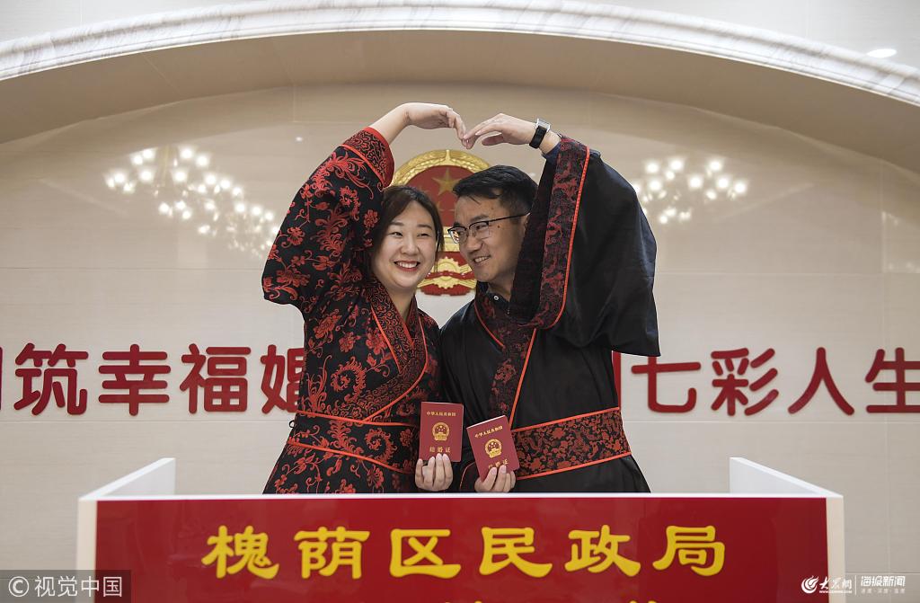 2019年3月8日,濟(jì)南,一對(duì)新人身著漢服領(lǐng)結(jié)婚證。當(dāng)日,在濟(jì)南槐蔭區(qū)民政局婚姻登記處舉辦的“婚禮式頒證”儀式上,新人們身著漢服許下承諾,在父母親友的見(jiàn)證下喜領(lǐng)結(jié)婚證。 張勇(山東分社)/中新社/視覺(jué)中國(guó)