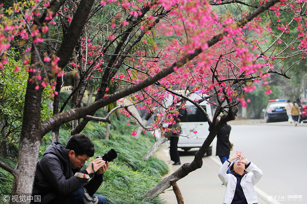 2019年3月9日,在武漢大學(xué)校醫(yī)院旁的珞珈山畔,早櫻迎春綻放,吸引了不少市民和攝影愛好者前來觀賞、拍照。
